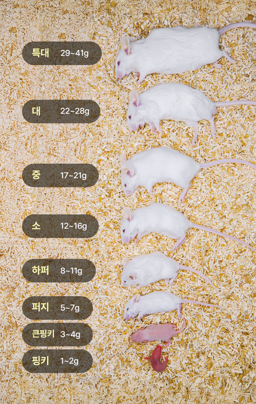 피더스 농장에서 직접 기른 먹이용 라이브 마우스입니다. 건강한 상태의 개체만 선별하여 공급합니다. 먹이 반응 유도에 효과적이며 자연에 가까운 급여 환경을 조성해 줄 수 있습니다.
